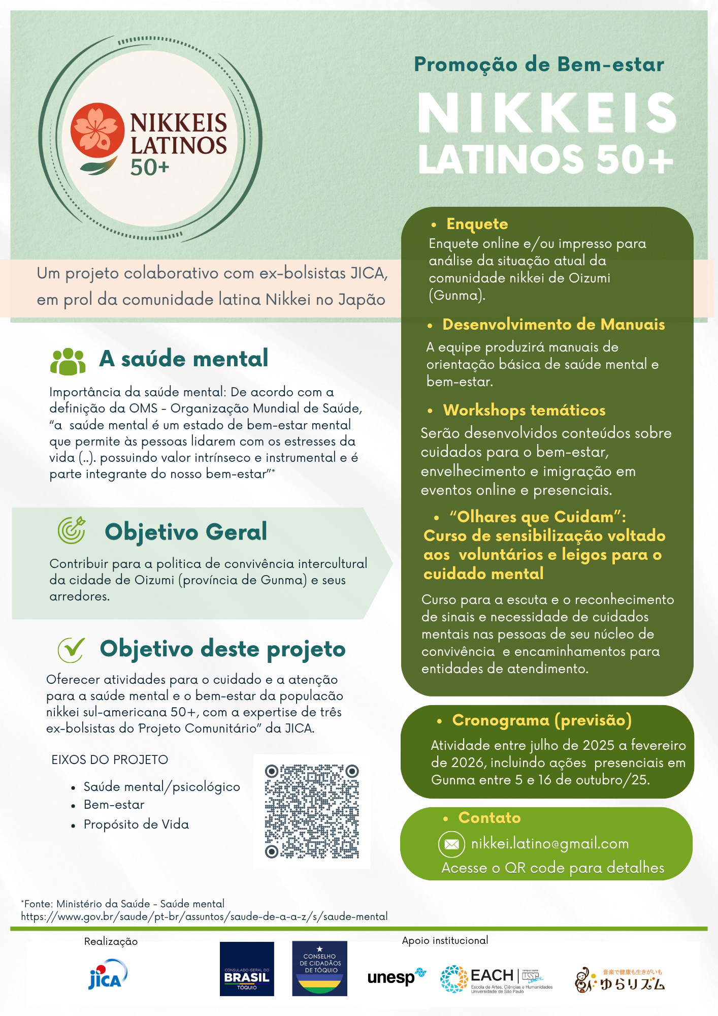 ● Atividades comunitárias presenciais: em outubro de 2025, durante dez dias, nas cidades com alta concentração de comunidade Nikkei latina como Oizumi, Isezaki e Ota, onde pretende realizar ações presenciais como: apoio no preenchimento de enquetes, atividades em grupo como roda de conversas, e minipalestras de orientação.