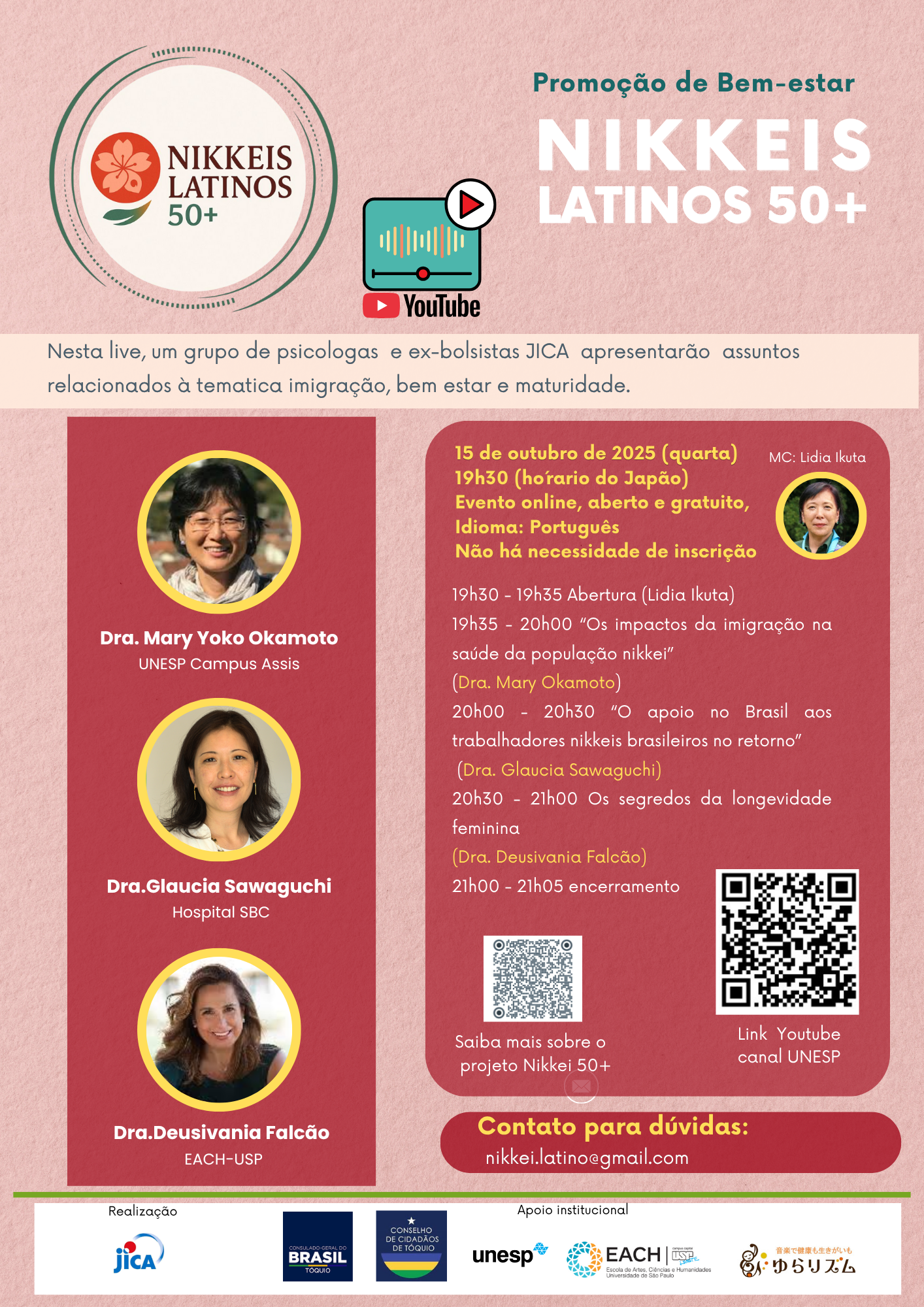 Entre agosto de 2025 até fevereiro de 2026, um grupo de 3 ex-bolsistas JICA atuará em um projeto colaborativo para promoção da saúde, voltado à comunidade Nikkei latina residente no Japão. Embora o projeto concentre as atividades na região de Gunma, participantes de outras províncias serão muito bem recebidos.