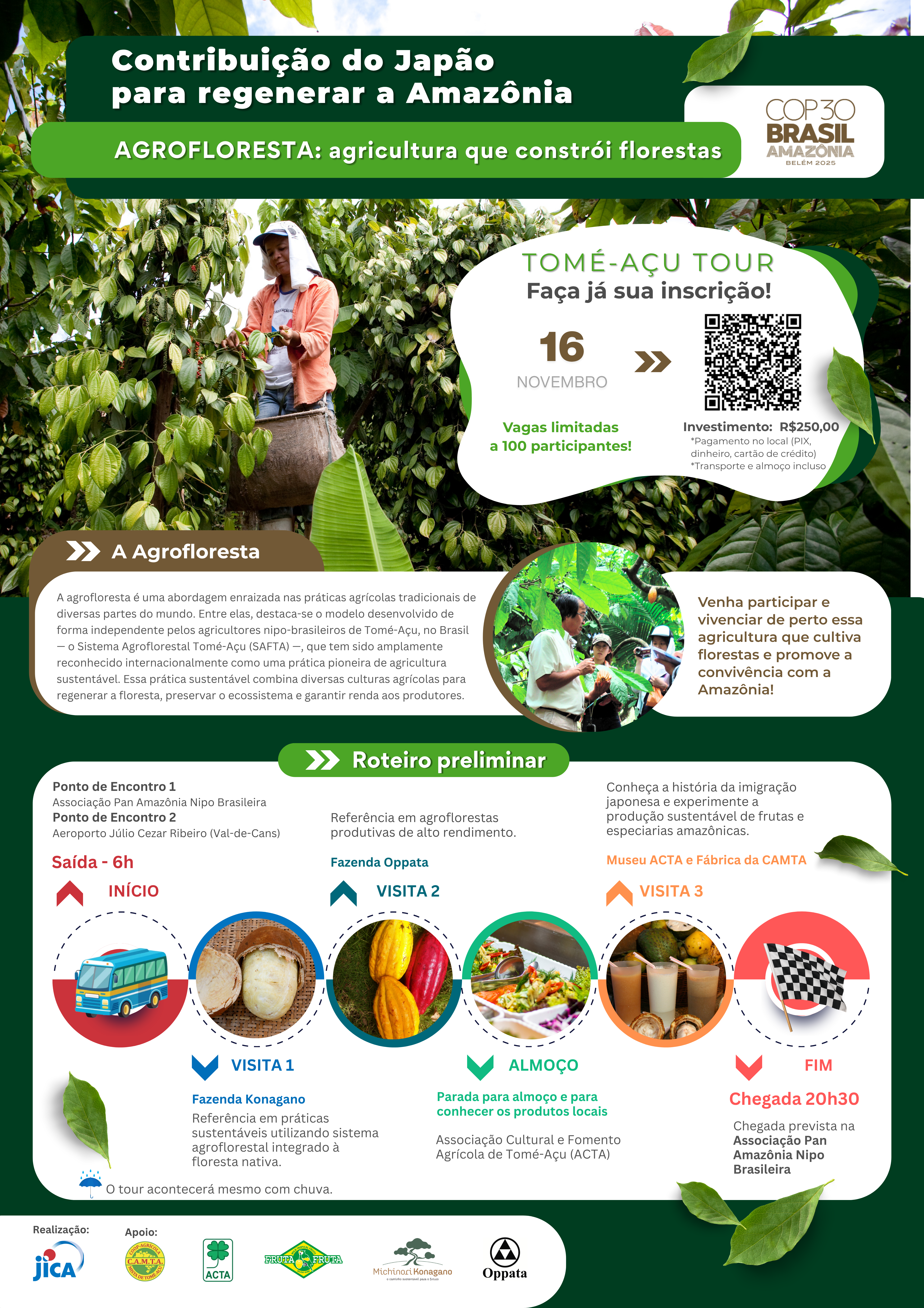 Em conexão com esse evento, o Escritório da JICA no Brasil, com o apoio da Cooperativa Agrícola Mista de Tomé-Açu (CAMTA) e da Associação Cultural e Agrícola de Tomé-Açu (ACTA), organizará o “Tour de Agrofloresta de Tomé-Açu”.