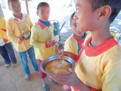 この日はキャッサバ(芋の一種)のスープ。「給食があるとうれしい」と、学校に行くきっかけにもなる。