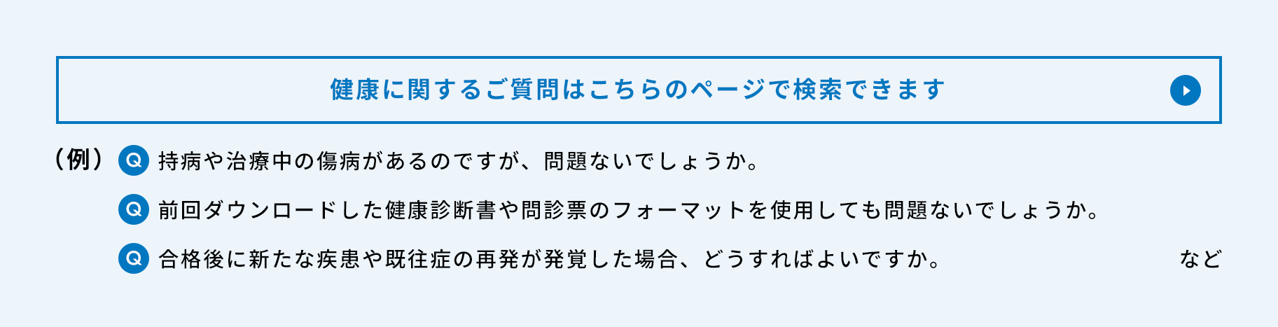 健康判定審査基準はお伝えできませんが以下の一般的な基準値をご確認いただき、日ごろからご自身で健康管理をお願いします。選考への影響についてはお答えできませんのでご了承ください。