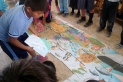 授業は中村さんとCPの二人三脚。中村さんがスライド資料をつくり、CPがそれを使って講義を行うという分担でスタートさせた。講義のテーマは「海洋の生態系」や「パラカス国立保護区」など。テーマや講義の内容はCPが考えたが、やがて中村さんの提案で「アクティビティ」も積極的に取り入れるようになった。アクティビティの考案で参考にしたのは、「海洋学習」の教材を紹介・提供するウェブサイト「LAB to CLASS(*2)」だ。子どもたちに特に好評だったアクティビティは、「海中の情景を描いた巨大パズル」など。楽しみながら学べる授業は好評となり、小学校4校でそれぞれ月に1度ずつ授業を行うことが定着していった。