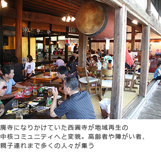 その手法は少しずつ形を変えていくことになるが、最初につくったのが「西圓寺(さいえんじ)」(石川県小松市)を活用した高齢者のデイサービス施設だ。住職が亡くなり廃れてしまった寺を何とかしてほしいと、地域の人々に依頼されて再生したものだ。温泉を掘り、カフェをつくり、地域に開放した。そこでは、デイサービスを利用する高齢者だけでなく、職員として働く障がい者、温泉利用客、遊びにやってくる近所の子どもたちと、さまざまな人が集まって交流している。地域に定住する若者が増え、過疎化に歯止めがかかっただけでなく、魅力を感じた若い世代が周辺に移住してくるようになり、開所当時の2008年には55世帯だった世帯数が2016年には72世帯と、約3割も増えている。