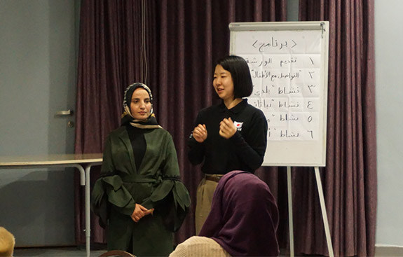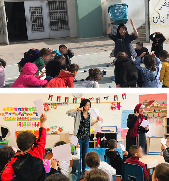 現地では、首都アンマン近郊にあるいくつかの幼稚園を巡回し、現地の先生たちと一緒に、子どもと身体を動かしたり考えたりするアクティビティを行いました。玉入れ・綱引き・かけっこ・鬼ごっこなどの運動、絵の具遊びや折り紙、さらに現地の先生たちは教育系のアクティビティ(文字のカルタや数字ゲームなど)を好むので、そういったものもバランスよく紹介しました。また週の半分くらいは、幼稚園が終わった後に、私が所属していた公立幼稚園を管轄する教育局に出かけて、幼児教育担当のカウンターパート※と共に運動会などの幼稚園行事や、先生向けのスキルアップワークショップの企画などもしていました。